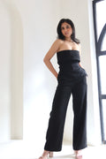High-waisted black trousers with a tailored pleat front and a fluid wide-leg silhouette. Effortless polish with a relaxed, elongating fit.