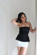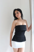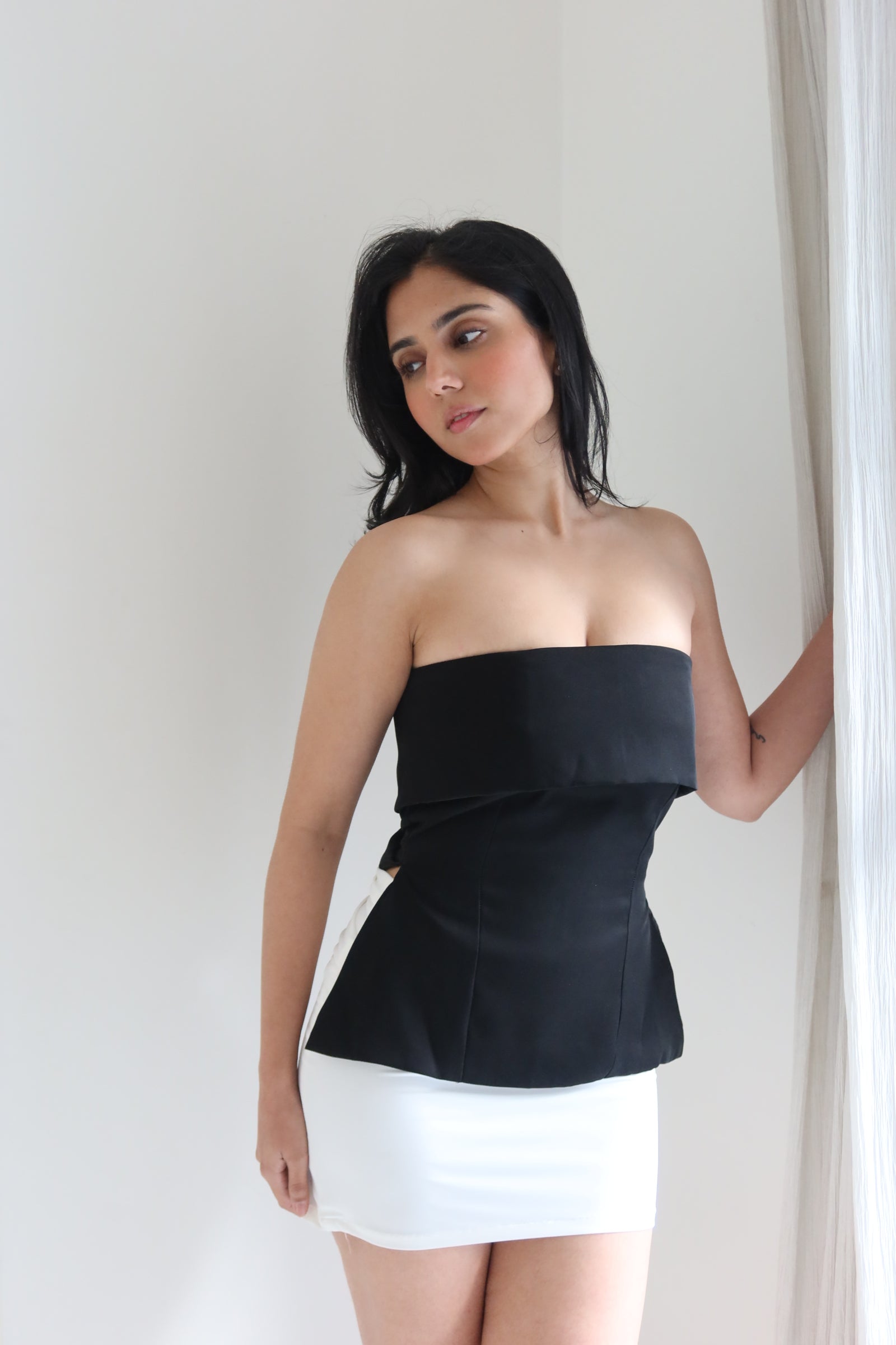 Our best selling set in a new colour now! A structured strapless top with a clean foldover neckline and a sculpted waist. Minimal, sharp, and tailored for an elevated finish.
