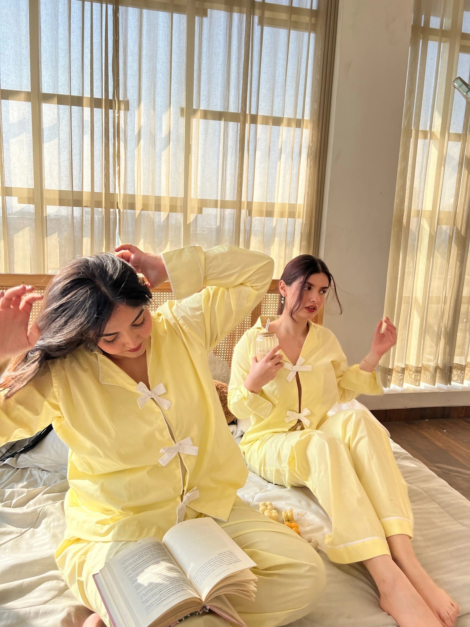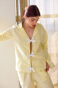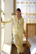 This elegant two-piece set exudes a sophisticated charm with its soft pastel yellow hue. The top features a modern silhouette with a relaxed fit, accented by delicate white bow closures down the front, adding a touch of feminine detail. The full-length pants are tailored with a loose fit and an elastic waistband, ensuring maximum comfort and style. Crafted from lightweight and breathable fabric, this set is perfect for lounging or casual outings, combining effortless grace with practicality.