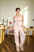 The matching full-length pants are high-waisted with an elastic waistband for a comfortable and flattering fit.