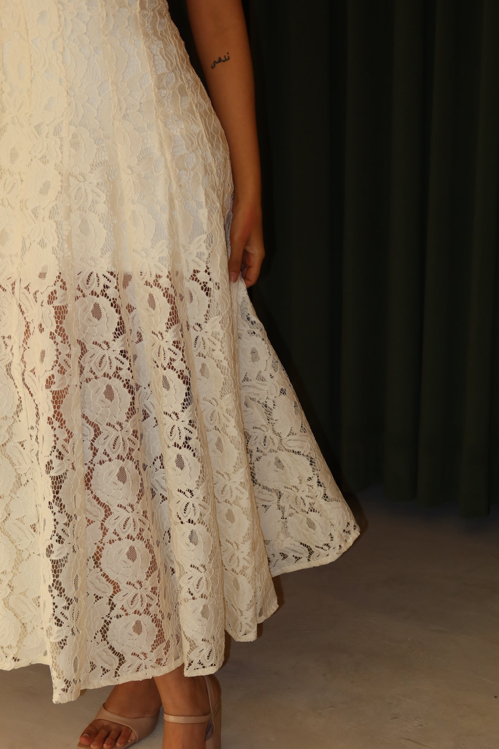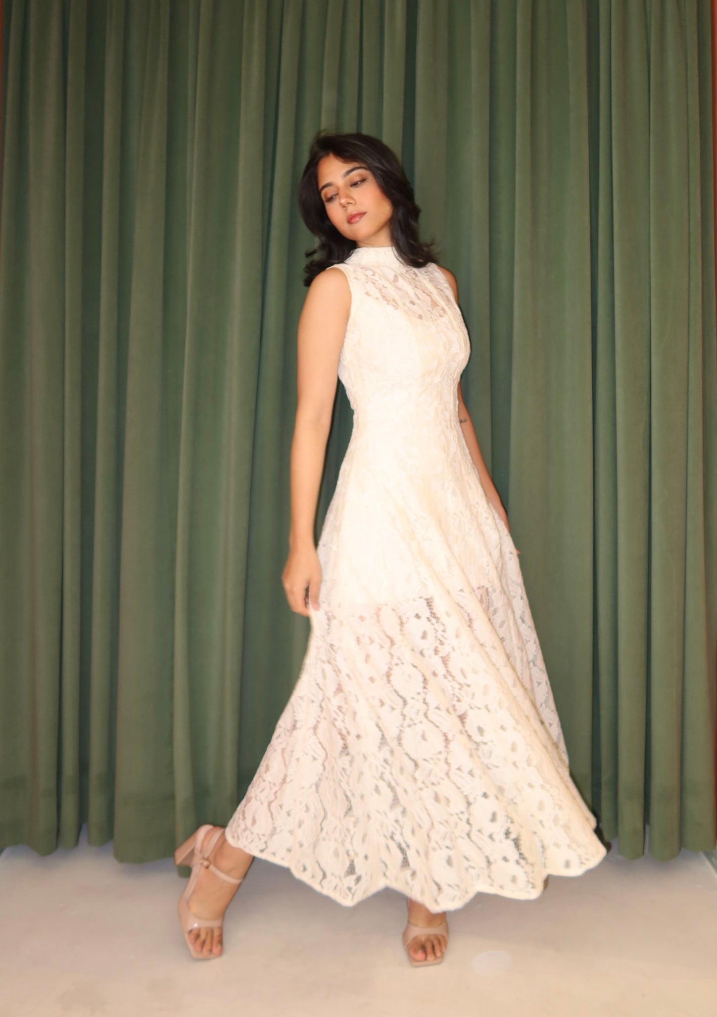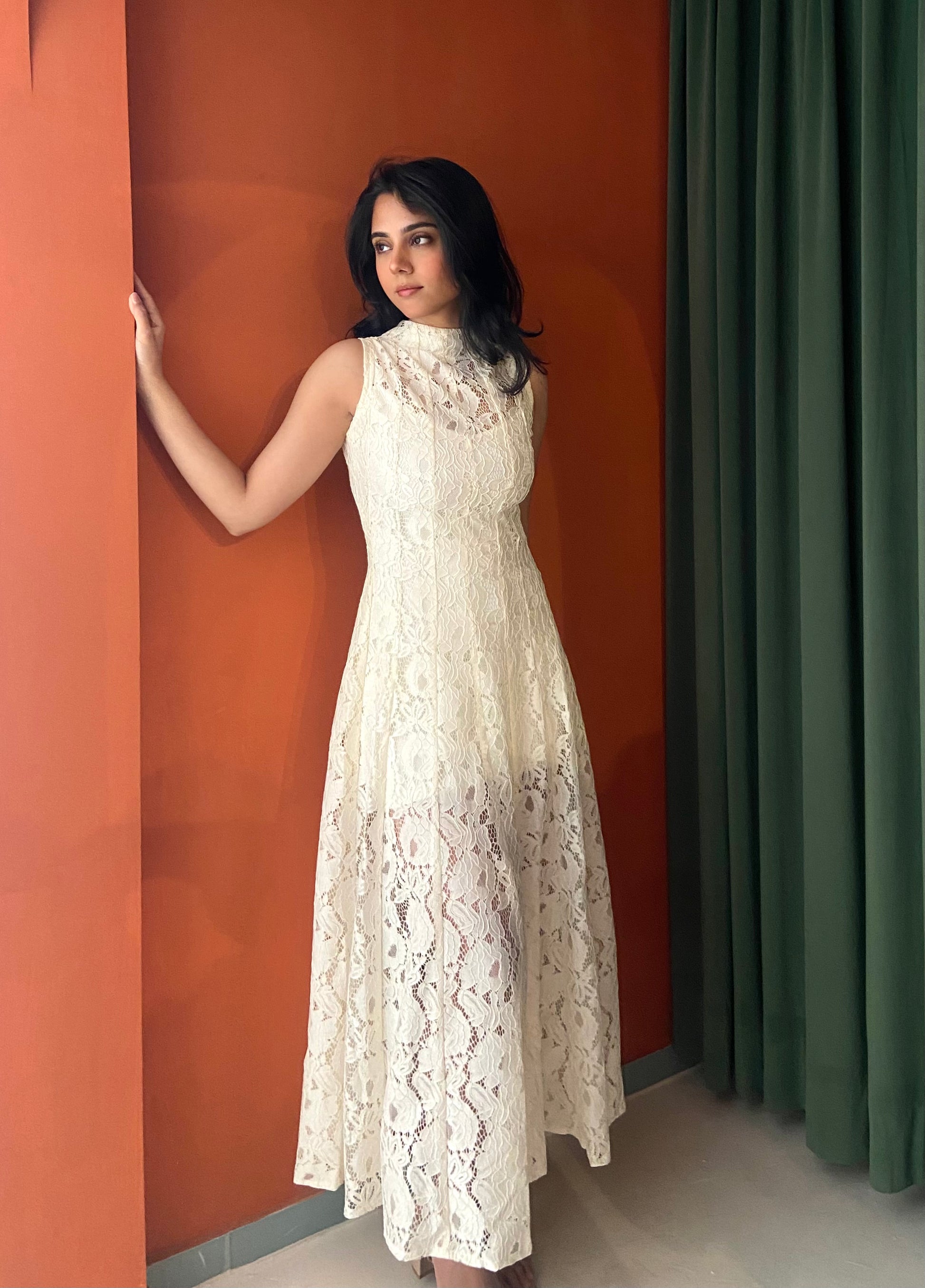 A fully-panelled lace maxi with a soft, floating silhouette. The sheer pattern adds lightness, while the included cami slip keeps it wearable without taking away the lace texture. High neck, sleeveless cut, and a graceful fall that moves beautifully.