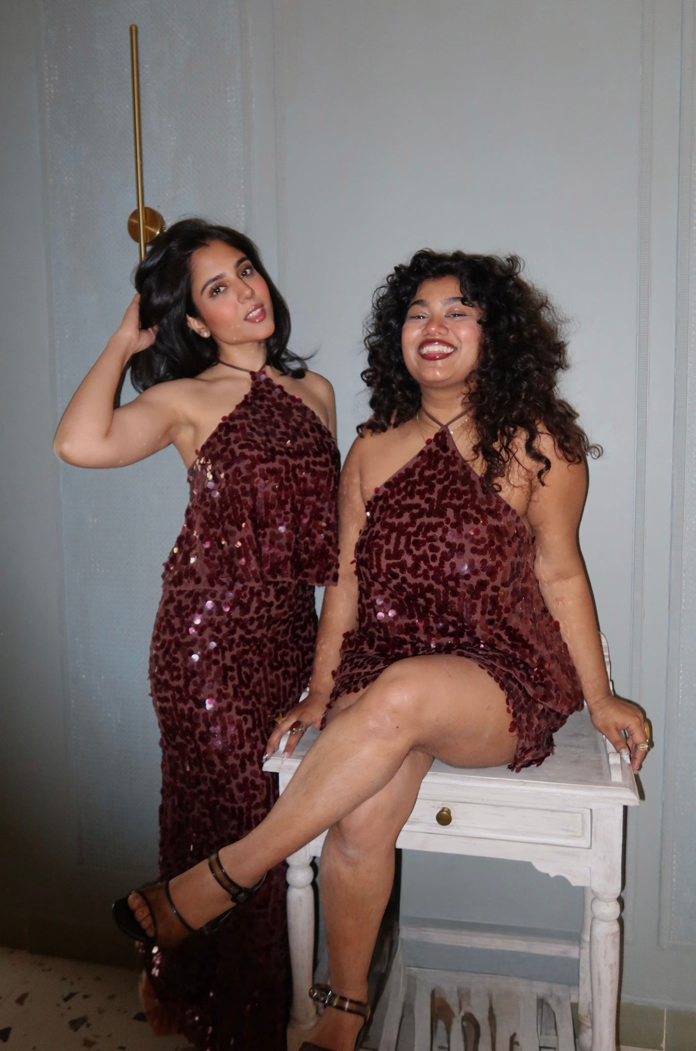 A straight wine sequin maxi skirt in soft, stretchy mesh that molds comfortably while keeping a clean, elongated silhouette. Elegant shine with effortless movement.