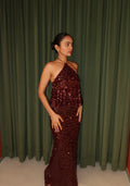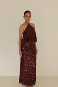 A straight wine sequin maxi skirt in soft, stretchy mesh that molds comfortably while keeping a clean, elongated silhouette. Elegant shine with effortless movement.