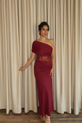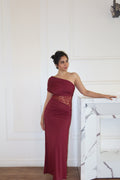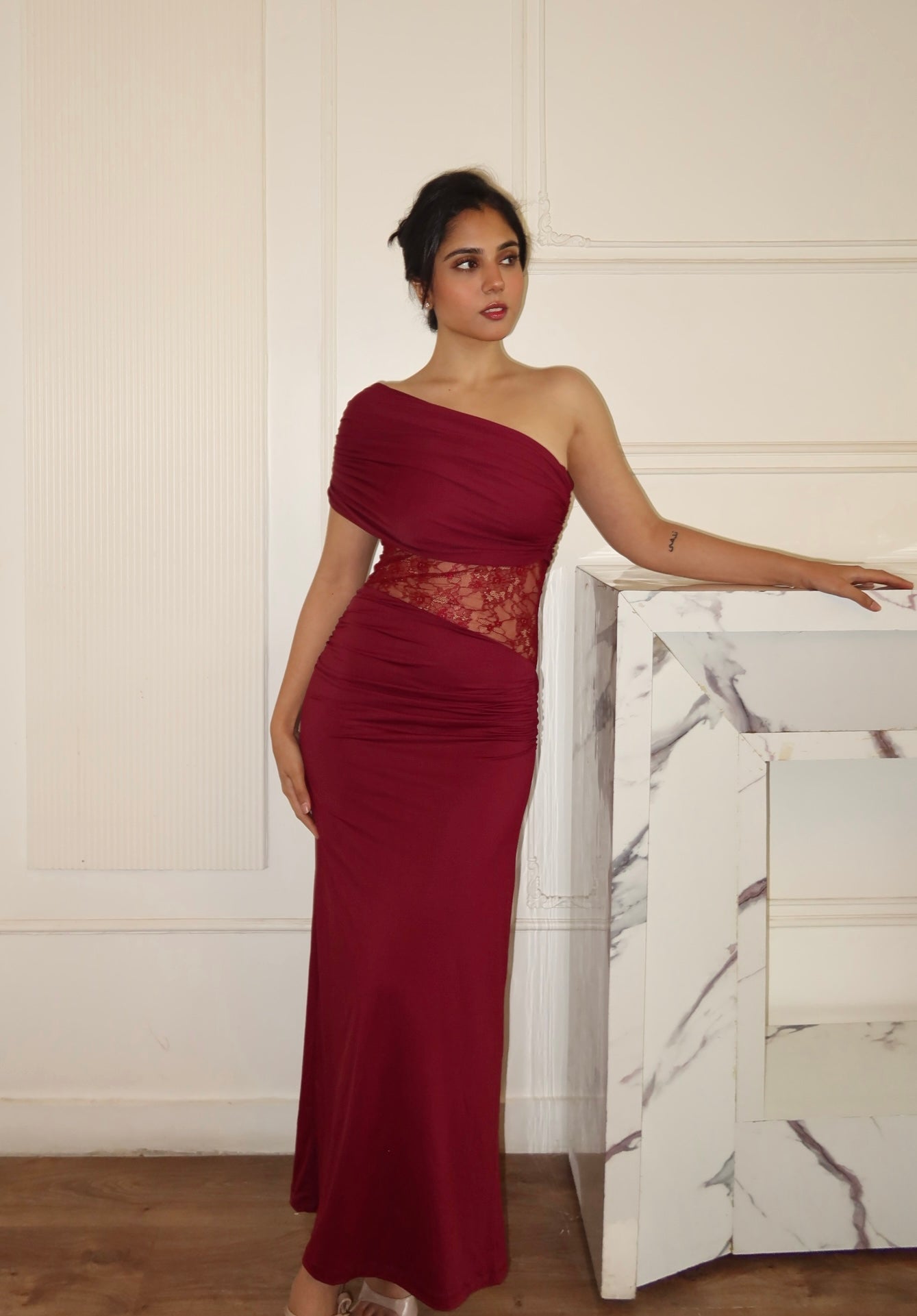 Designed to command attention, this one-shoulder stretch maxi carves out your shape with ease. The lace waist cut gives a sharp contrast, adding just the right amount of edge to the deep wine hue.