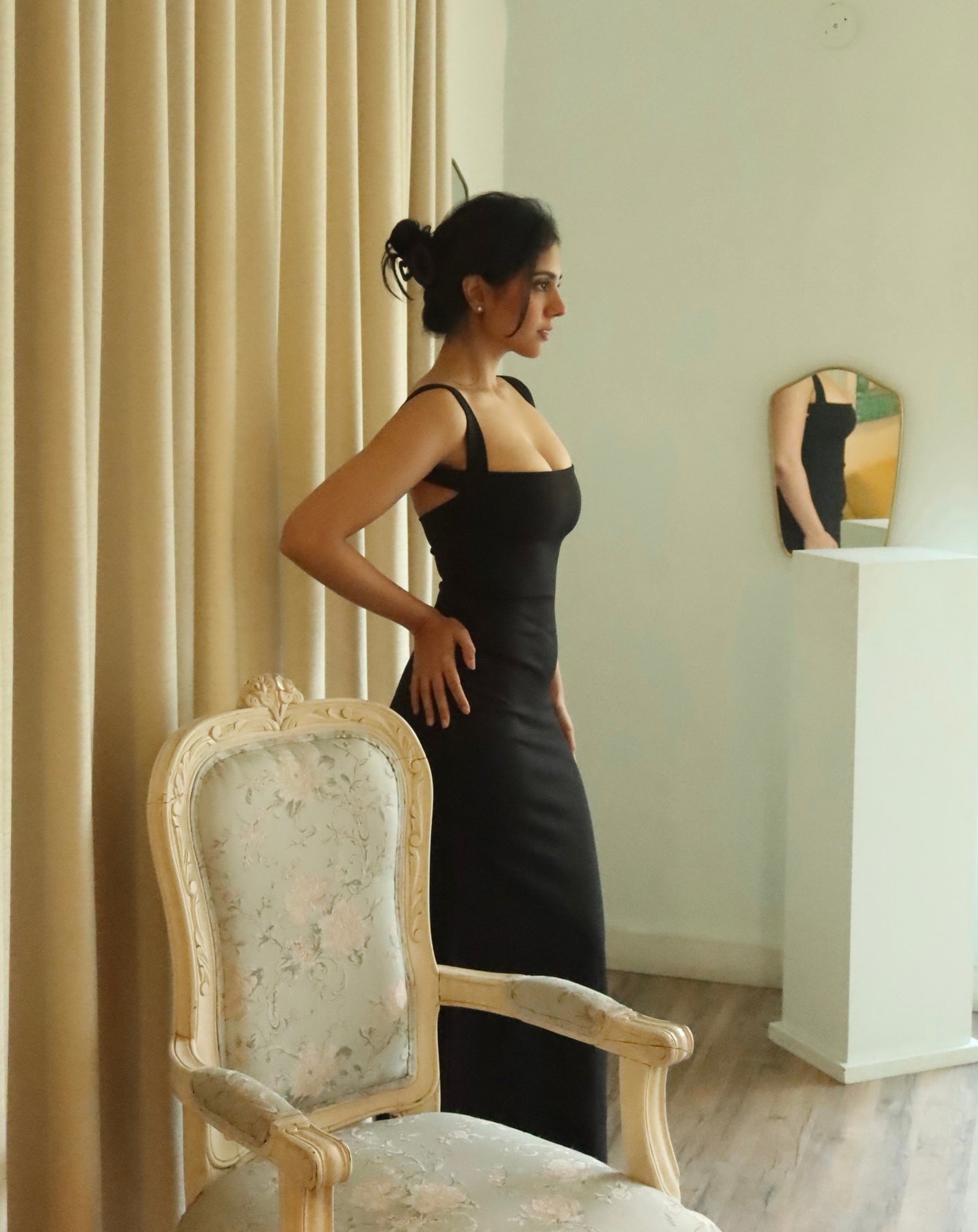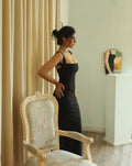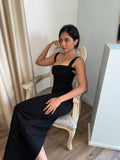 Clean square neckline, wide straps, and a smooth stretch bodycon fit. A simple black maxi that stays sharp and streamlined.