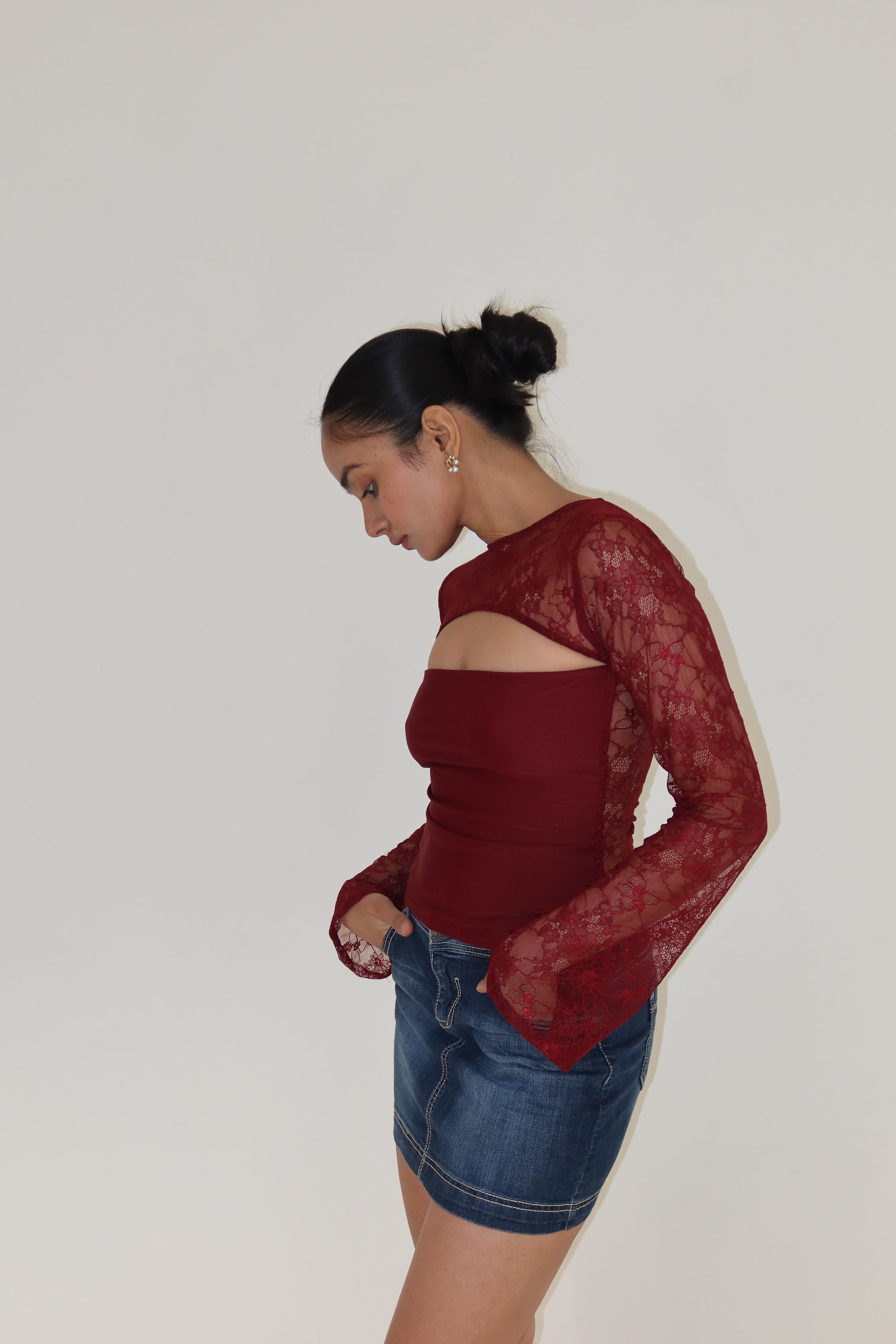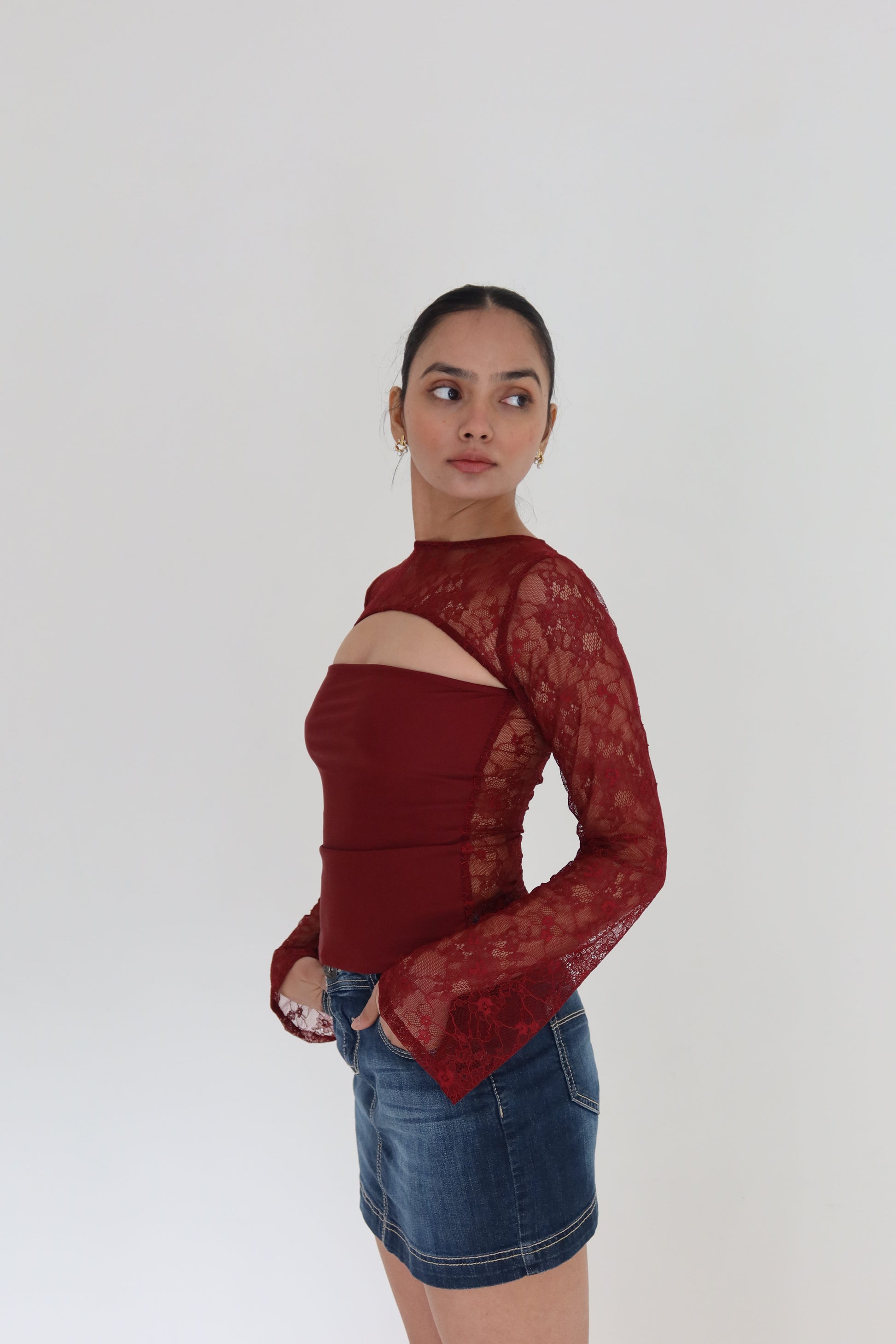 A deep wine lace top with a sculpted cut-out neckline and flared sleeves. The sheer lace overlay adds texture and detail, while the fitted inner bodice keeps the shape structured and refined.