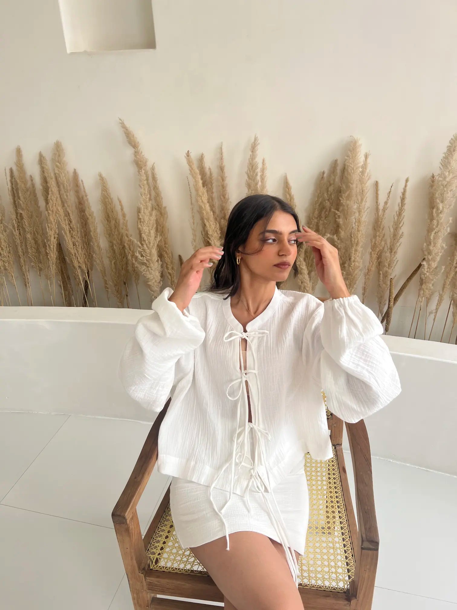 Get that effortless look with all the comfort this summer! Voluminous tie up top with a fitted skirt is super breathy and comfortable with a chic vibe, can be styled separately as well.