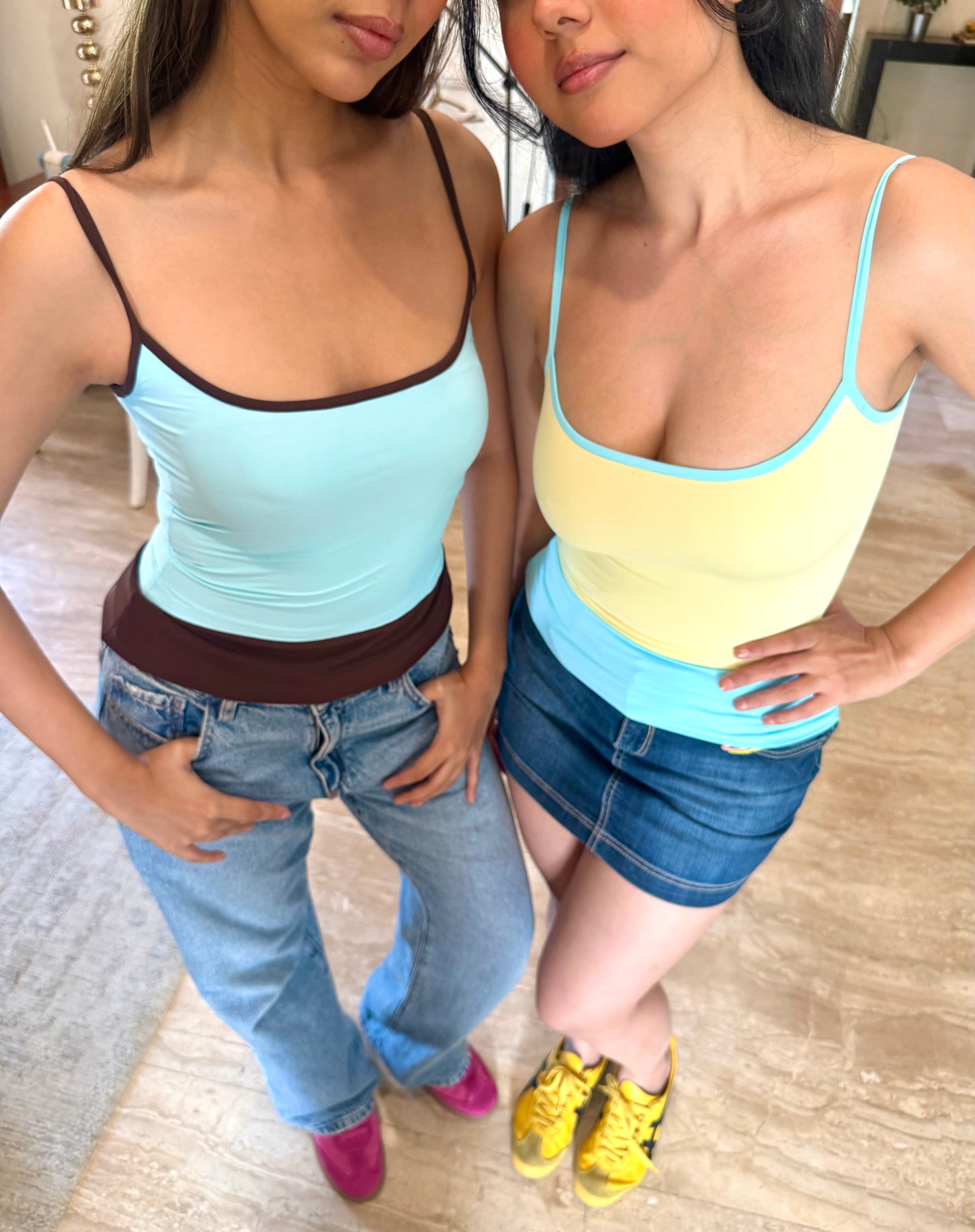 A fitted tank in soft four-way stretch fabric that sits close to the body without feeling restrictive. Designed with slim straps and contrast brown binding along the neckline, it adds a subtle detail that makes it feel more put-together than your everyday basic. Easy to pair with denim or layer under jackets.