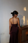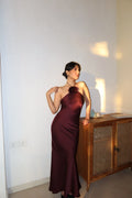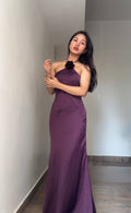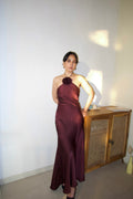 Crafted from luxurious satin, the dress features a bias-cut design for a flaterring silhouette and a statement flower at the neck. Perfect for special occasions!