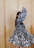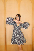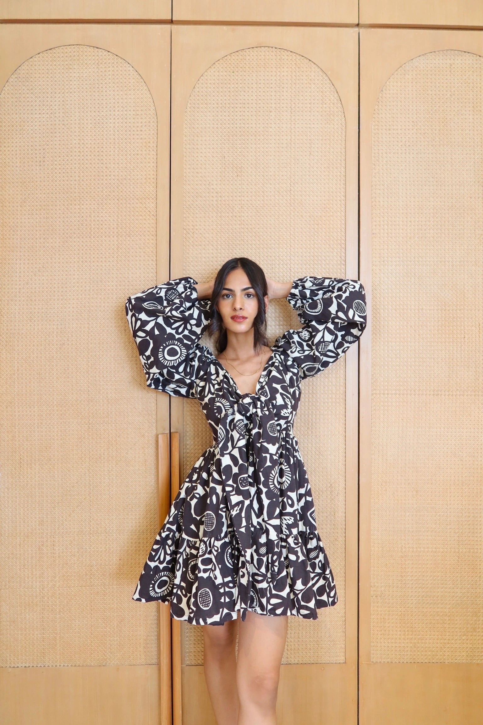Step into effortless style with this short-length dress, crafted from breathable cotton-linen fabric in a chic cream and black color palette. The flared silhouette and puff sleeves add a playful touch, while the front tie-up detail at the chest enhances its fun, flirty vibe. Perfect for sunny days and casual outings.