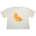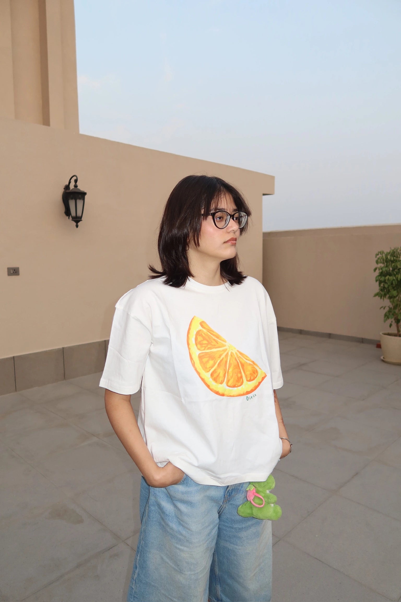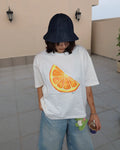 This oversized t-shirt features a vibrant orange slice print, crafted from soft, breathable cotton for all-day comfort. Its relaxed fit and playful design make it a fun, casual addition to any wardrobe.