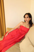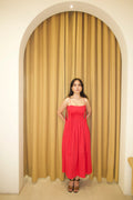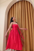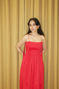 The scarlet dress features an elegant yet playful touch with the ruched bodice and tie up straps. Perfect for the christmas evening or even a casual outing.