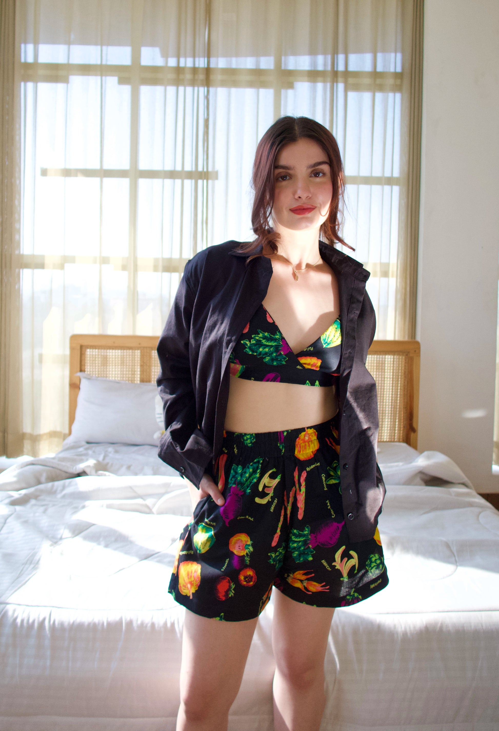 The veggies set comes with a plain black shirt, bralette and shorts. The bralette top features adjustable straps and a flattering wrap-style neckline for a customizable fit. The high-waisted shorts are designed with a relaxed silhouette and an elastic waistband for all-day ease. Both pieces are adorned with a colorful and artistic fruit and vegetable print on a black base, adding a touch of whimsy to your casual wardrobe. Perfect for lounging, relaxing, or pairing with other wardrobe staples for a unique statement look.